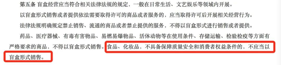 日前(6月15日),国家市场监督管理总局(以下简称“市监总局”)发布了一则《盲盒经营行为规范指引《试行》解读》(以下简称《规范》),明确规定:食品、化妆品,不具备保障质量安全和消费者权益条件的,不应当以盲盒形式销售。